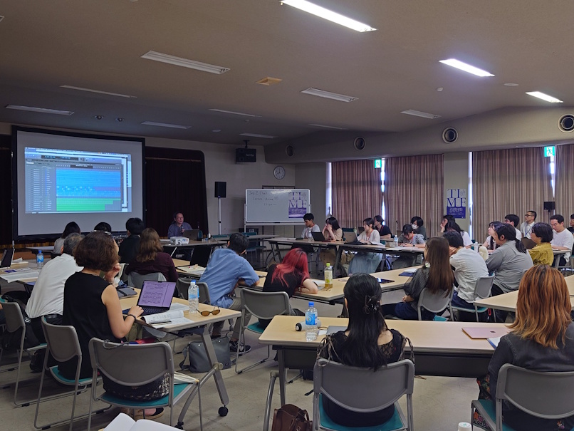 そこから例に挙げられた初期作品《インテルメッツィⅠ》(9月6日「新しい地平コンサートⅢ」で演奏される)は、そうした形式に対する当時の問題意識から、ロラン・バルトの著作の断章形式に発想を得て、曲題の通り複数の間奏曲の連続から構成されている。一見無関係な言葉の連なりが謎かけのように次なる想像を呼び込んでいくことで浮き彫りとなる関連性。それは、あたかも(バルト自身が言及しているように)俳句のようであり、西洋のシンメトリカルな建築ではなく日本の増築建築に近い。その上で望月が述べたのは、響きが日本的であることよりも音楽の構造や形式に於いて日本的であることの意味であった。レクチャー冒頭で自身が日本人であることと創作との関係性にも言及した望月は、常に「何を・誰のために・どのように書くのか」という創作行為の本質の問題の追求に強く意識的である必要性を説いた。AI全盛の現代だからこそ人間の発想が最重要になってくるという指摘や、作曲者の意図や工夫が聴き手に音楽として完全に知覚・認識されなければならないというメッセージは、表面的なアピール力や書き手の自己満足に終始する安易な創作姿勢への警鐘のように感じられ、私自身、身が引き締まる思いで受け止めた。受講生も改めて、それぞれの創作のこれまでの歩みとこれからの展望を見つめ直したに違いない。明日の第2回のレクチャーでは、望月作品の音楽性と思考世界のさらなる深みを掘り下げることになると予想され、期待が高まった。